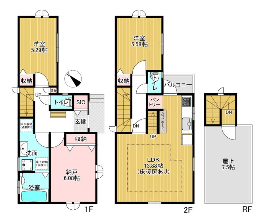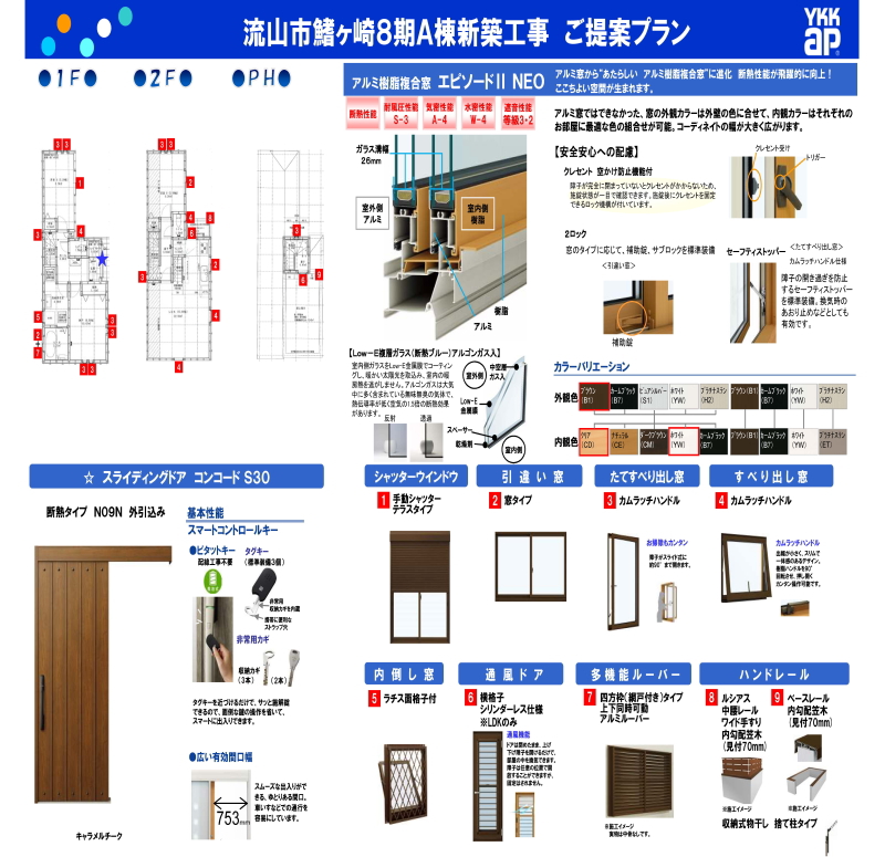 省エネ/断熱等級5・一次エネルギー消費量等級6 樹脂複合サッシ+Low-Eガラス 耐震・耐久・防火/ニチハ耐力面材「あんしん」全面張り 基礎巾 150 防犯/1F防犯ガラスOR面格子ORシャッター スマートキー(スマートフォン対応) 生活・家事応援/浴室換気乾燥暖房機・床暖房・食器洗浄乾燥機・家電収納付カップボード